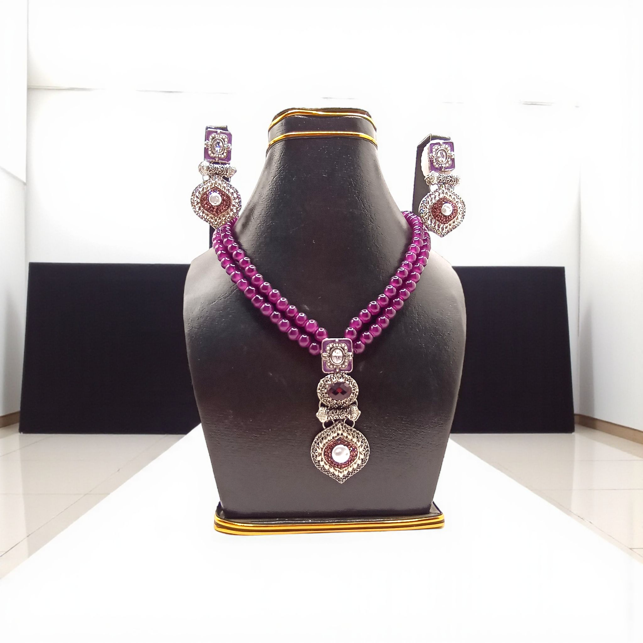 Shimmer in refined beauty with the Amethyst Shine Beaded Set, featuring radiant violet beads paired with silver-tone detailing and pearl-centered motifs. The triple-tier pendant adds depth and grace, making it a captivating pick for special events.