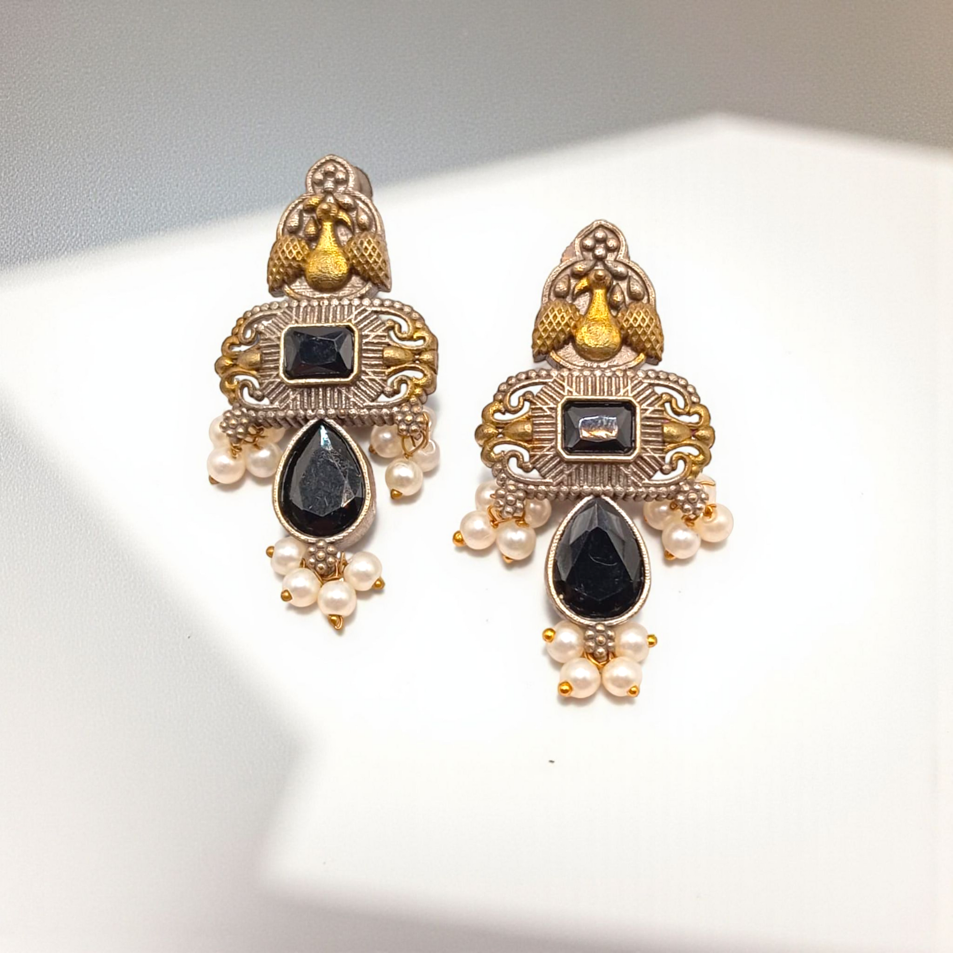 Vintage-inspired earrings adorned with different color of stones, intricate golden detailing, and delicate pearl drops. A timeless blend of tradition and elegance, perfect for festive or formal occasions.