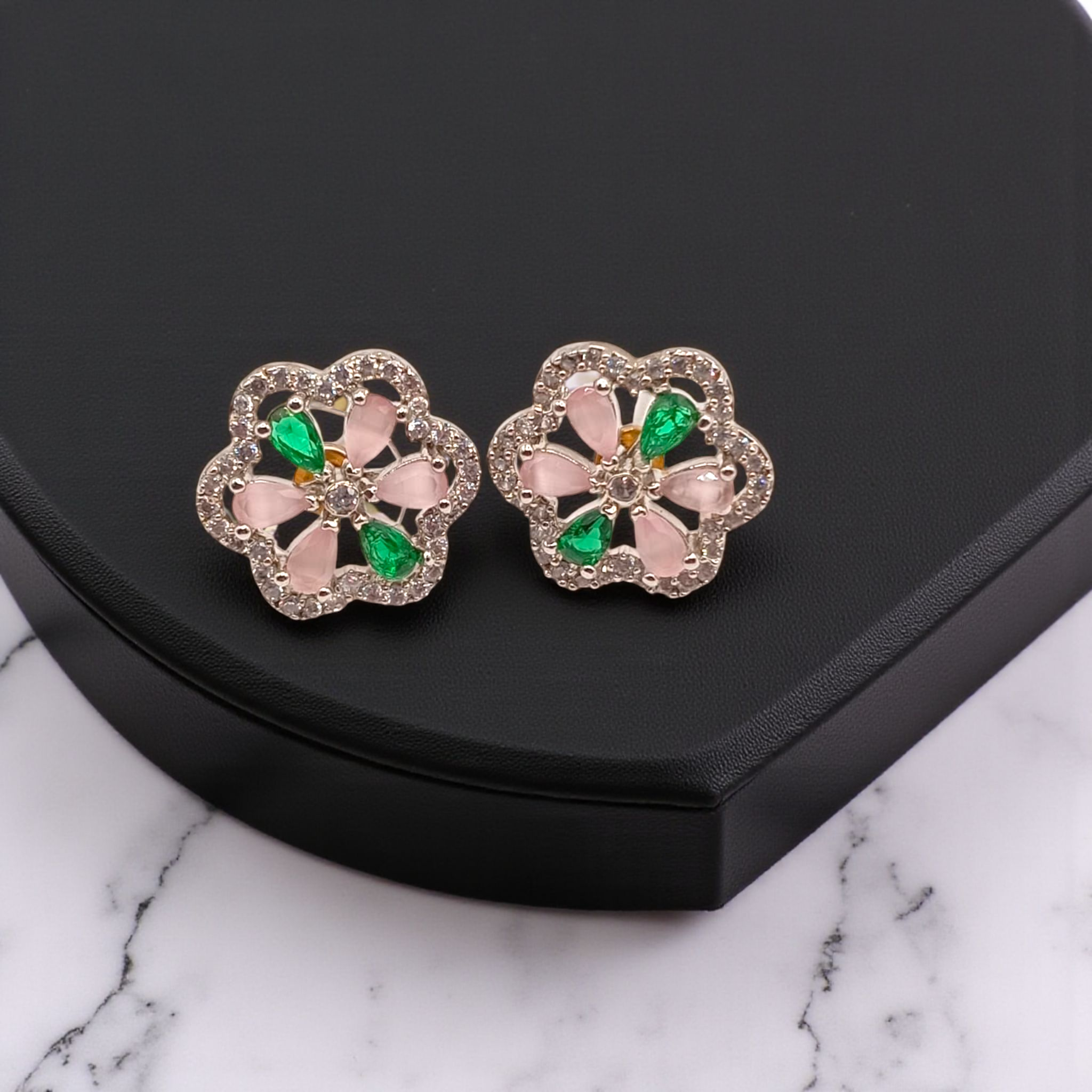 Delicate floral stud earrings featuring soft pink petals accented with vibrant green leaves, all outlined by sparkling zircon borders. A fresh and charming design perfect for adding a touch of elegance to any look.