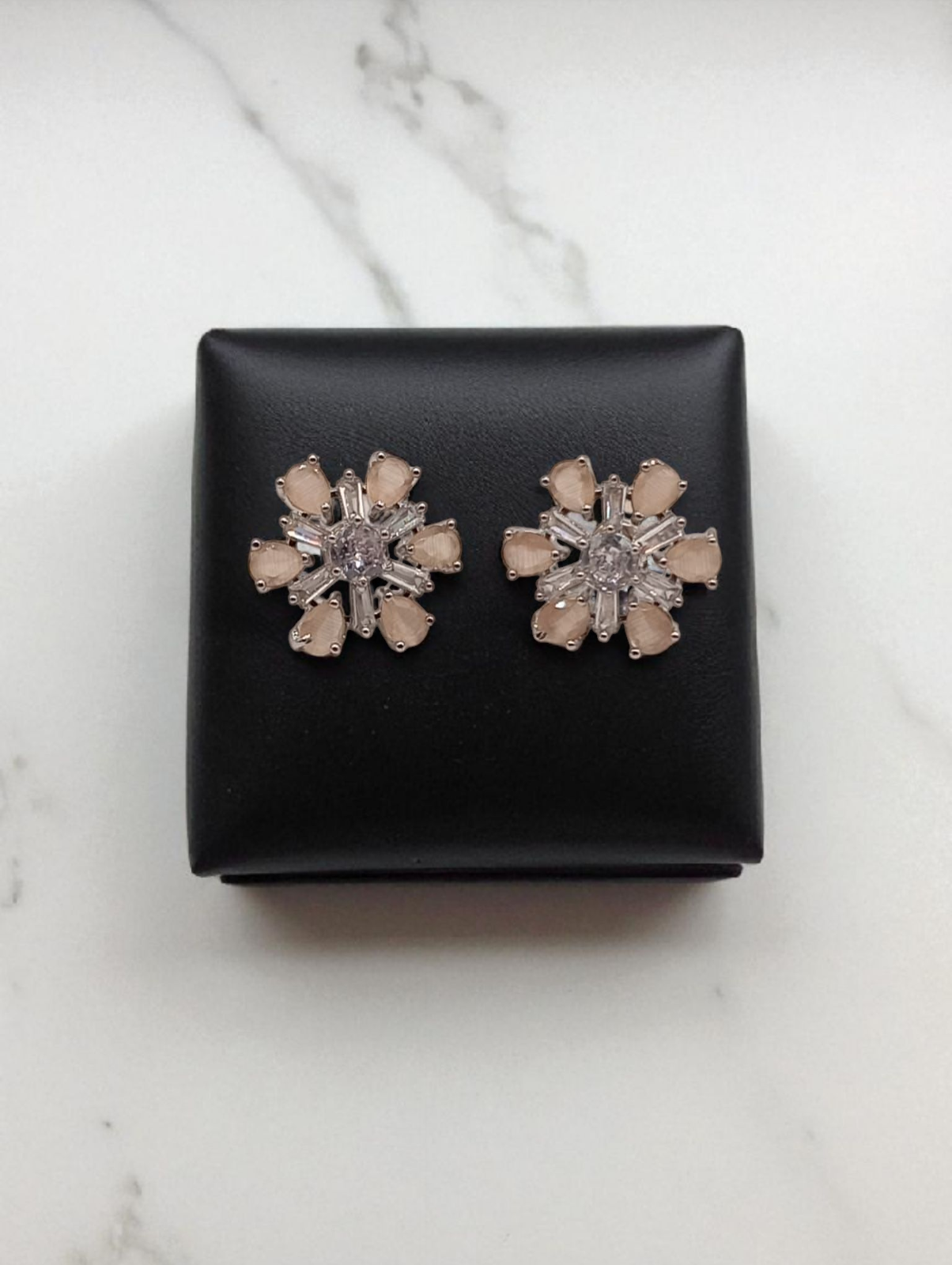 These stunning stud earrings feature a radiant champagne-toned petal design, accented with sparkling cubic zirconia for a touch of glamour. Perfect for weddings, parties, or adding sophistication to any look.