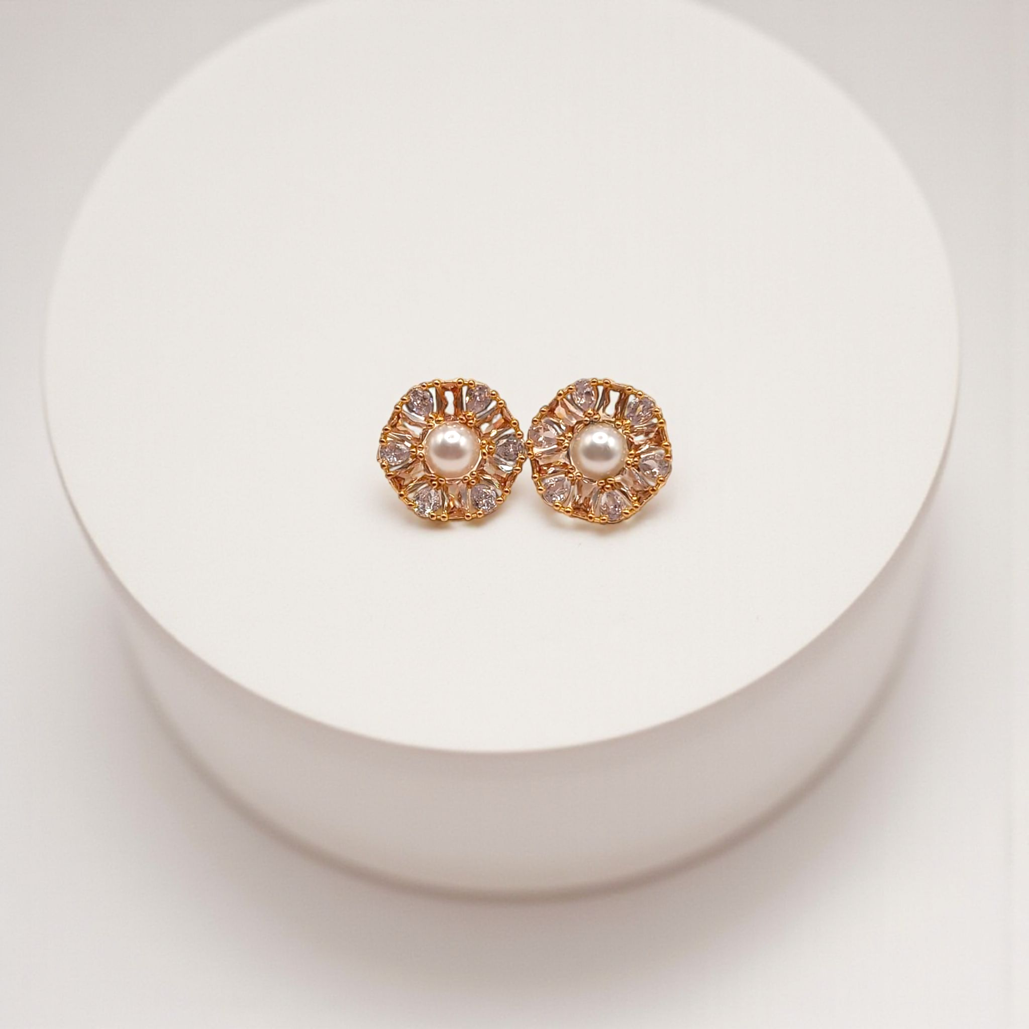 Sophisticated stud earrings featuring a luminous pearl center surrounded by a halo of sparkling crystals, perfect for adding timeless elegance to any outfit.