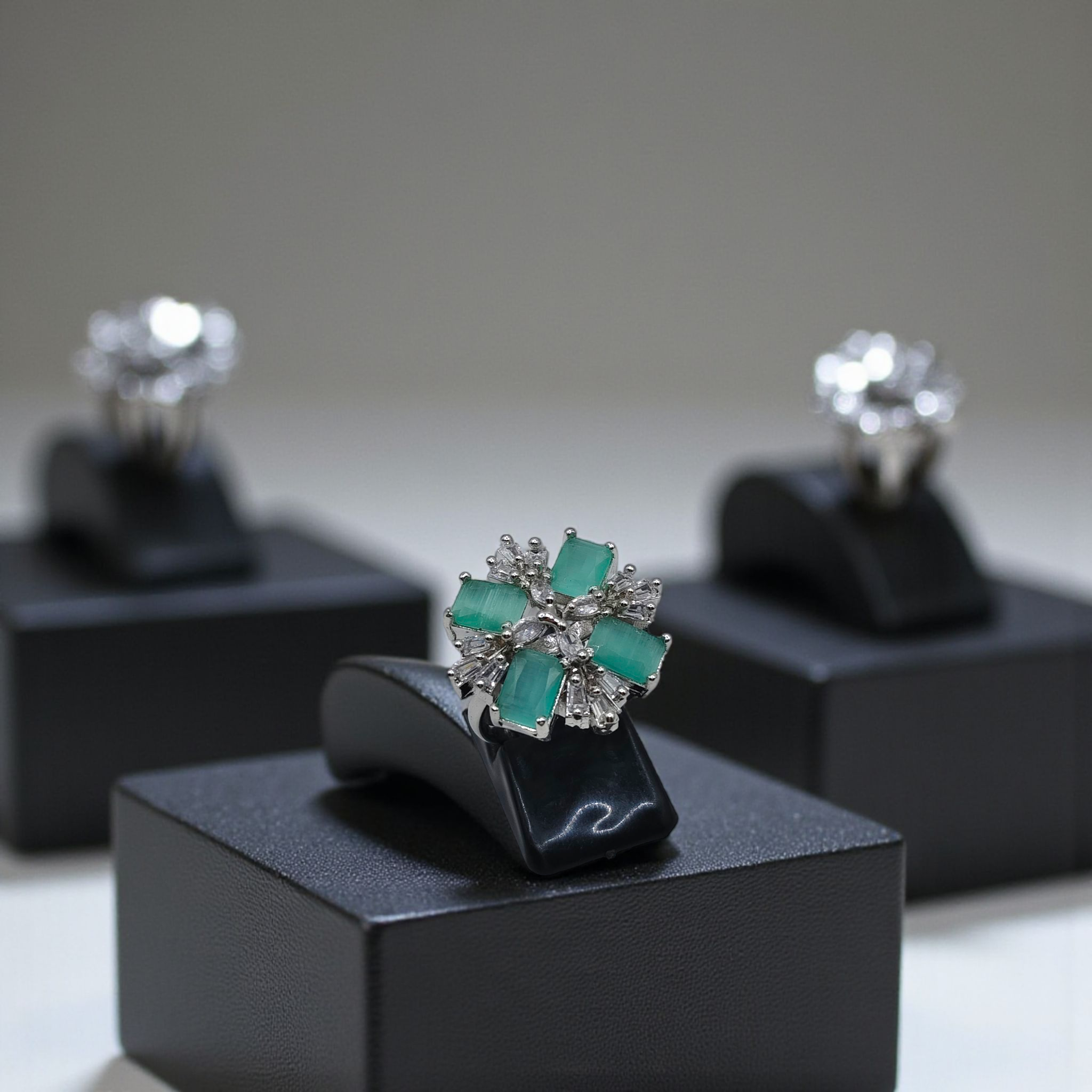 These bold floral statement rings feature a cluster of radiant gemstones arranged in a blooming design, accented by sparkling crystal details. Perfect for adding a pop of color and glamour to any outfit.