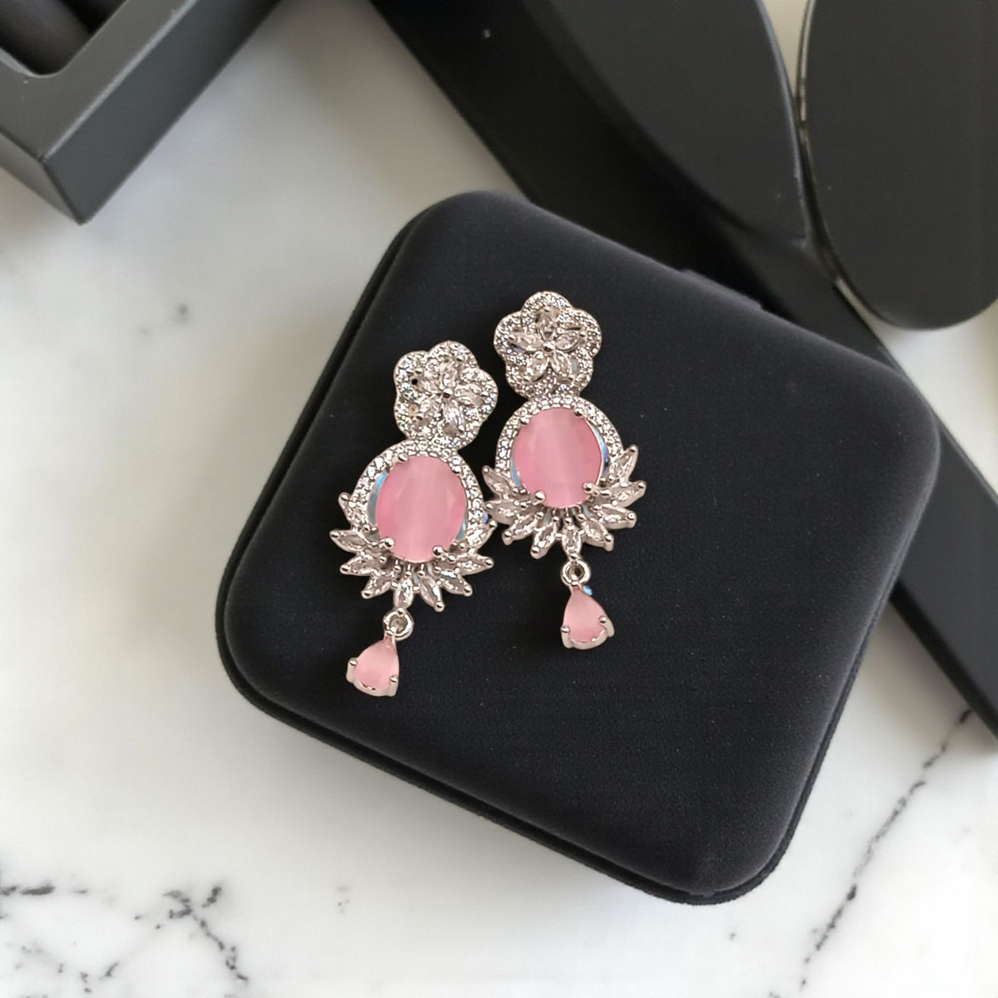 Charming drop earrings featuring soft pink oval stones, crystal-studded floral tops, and teardrop dangles, adding a graceful sparkle to your look.