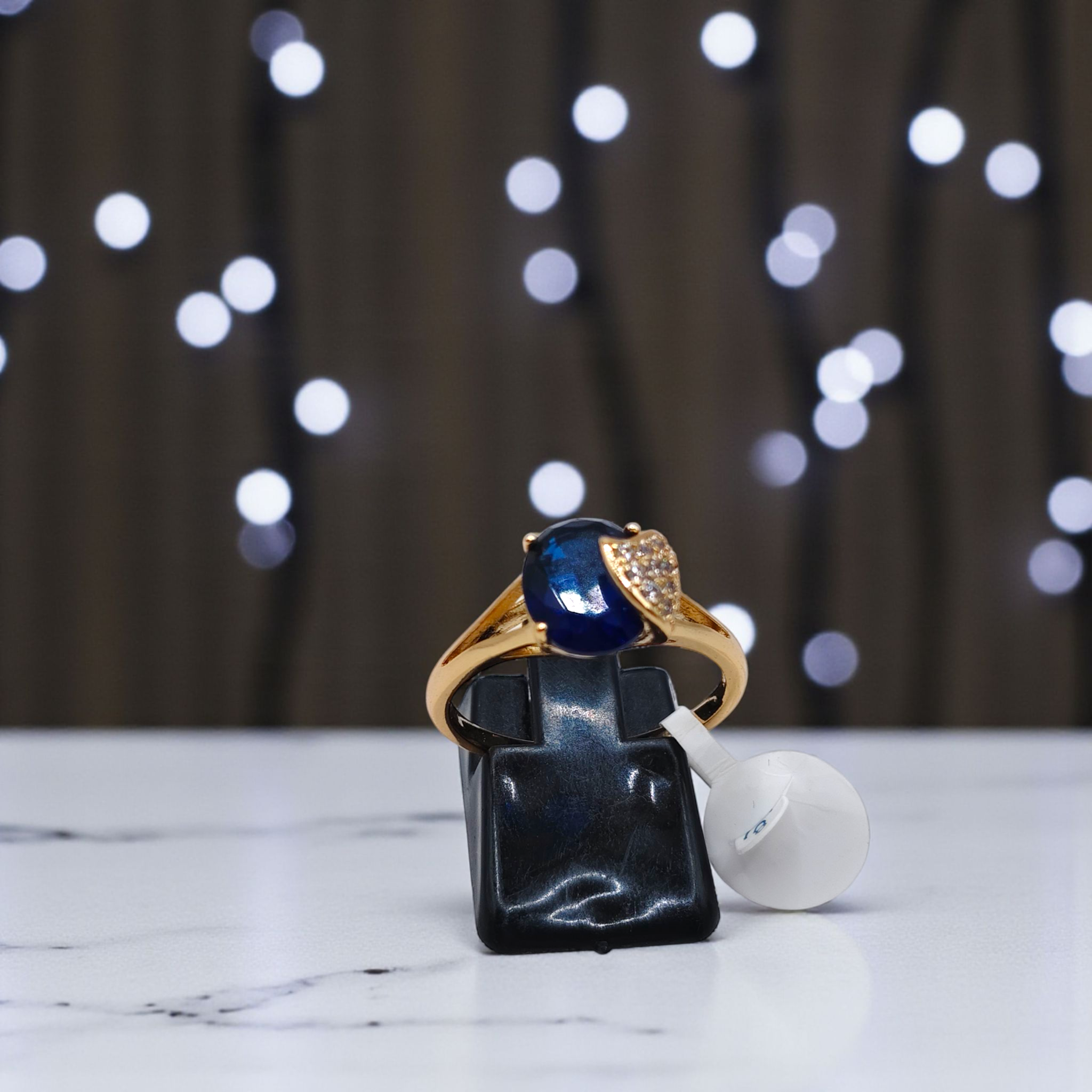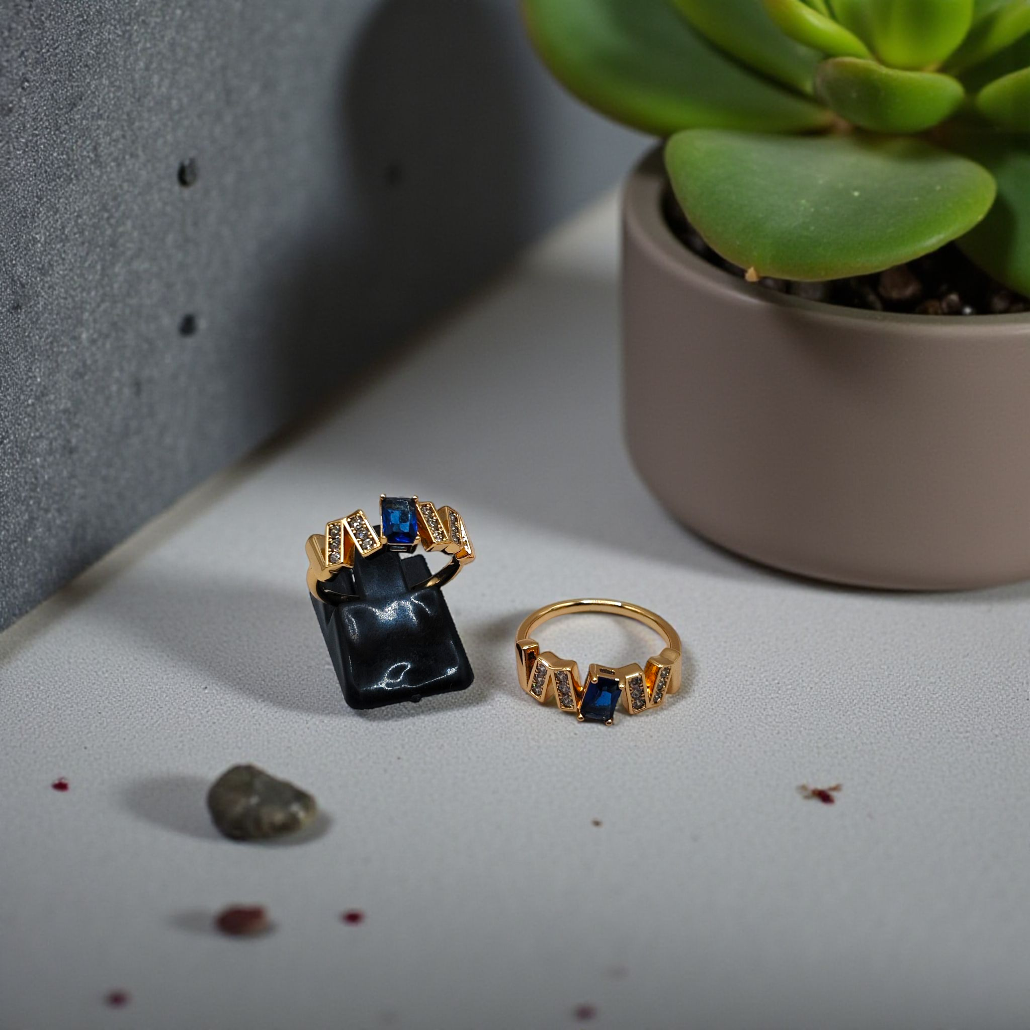 This bold gold-tone ring features a striking rectangular gemstone centerpiece accented by geometric, crystal-encrusted patterns. Its modern design with sharp edges brings a unique blend of sophistication and contemporary style. Perfect for making a statement.