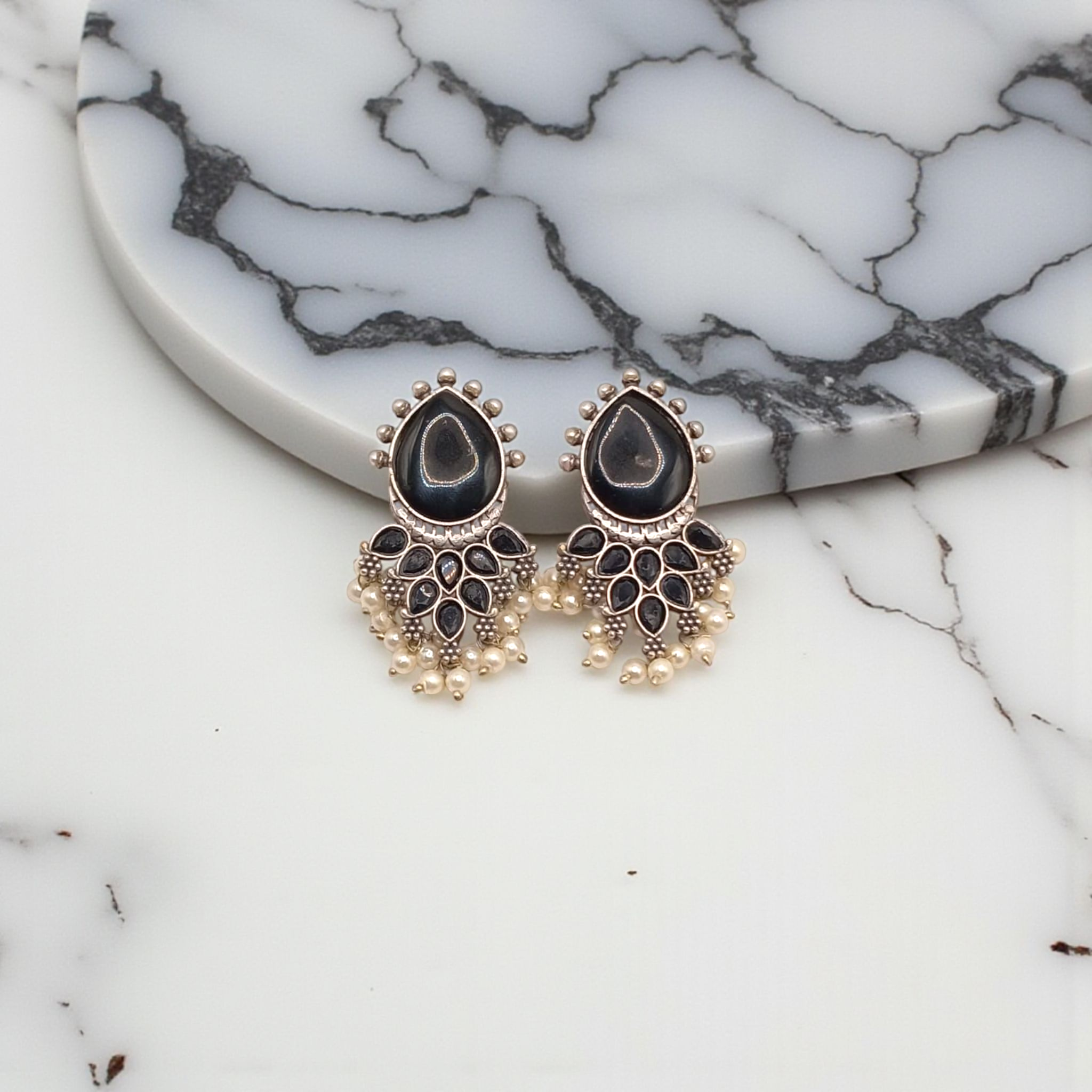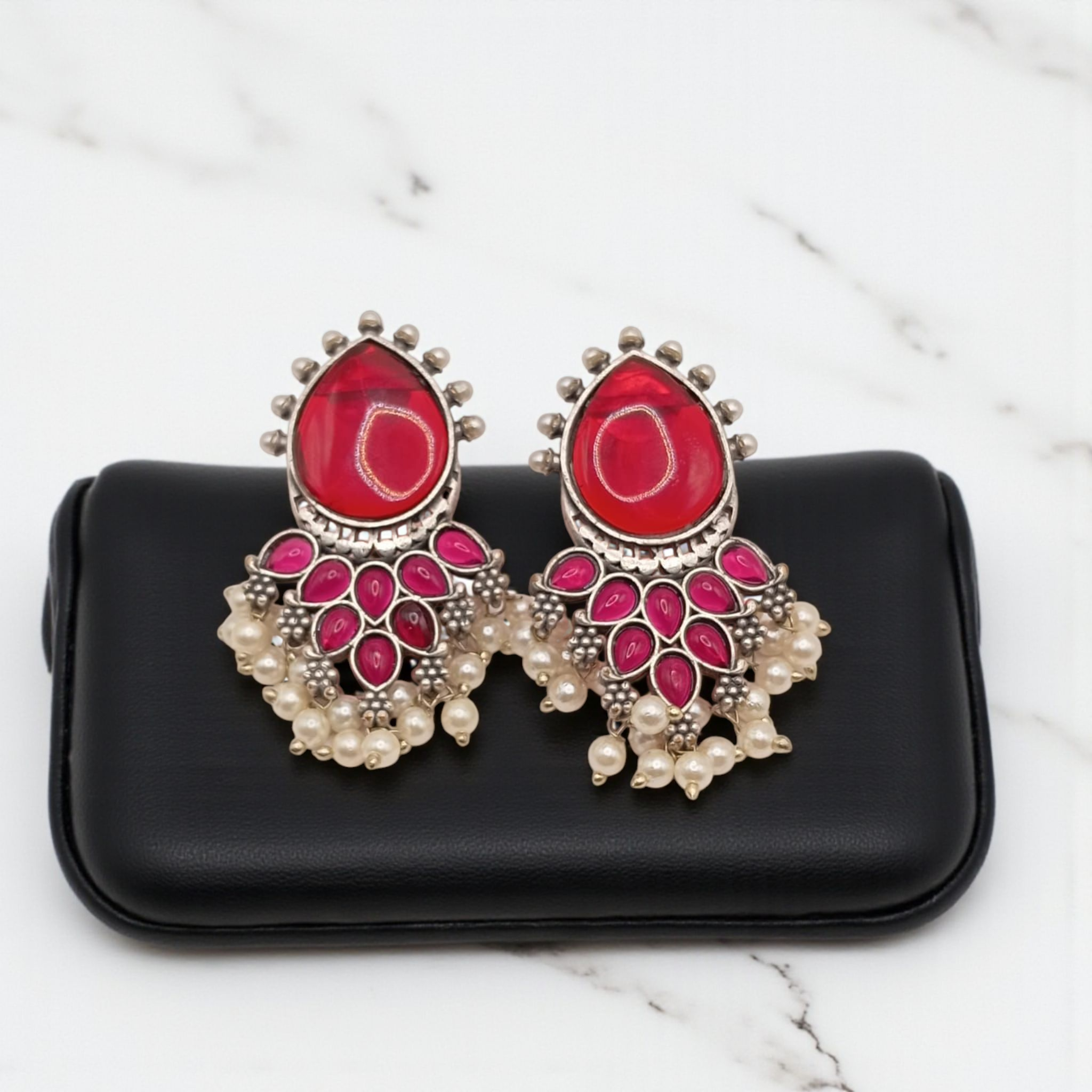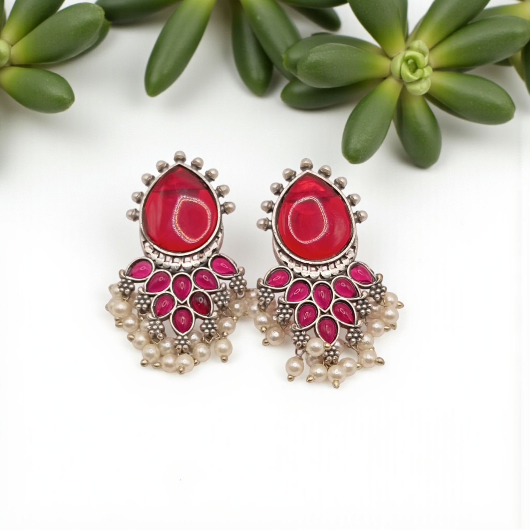 Bold and beautiful, these handcrafted earrings feature striking teardrop-shaped red stones framed in oxidized silver, detailed with petal motifs and finished with cascading pearl beads. A perfect choice for festive and ethnic looks that need a touch of vibrant elegance.