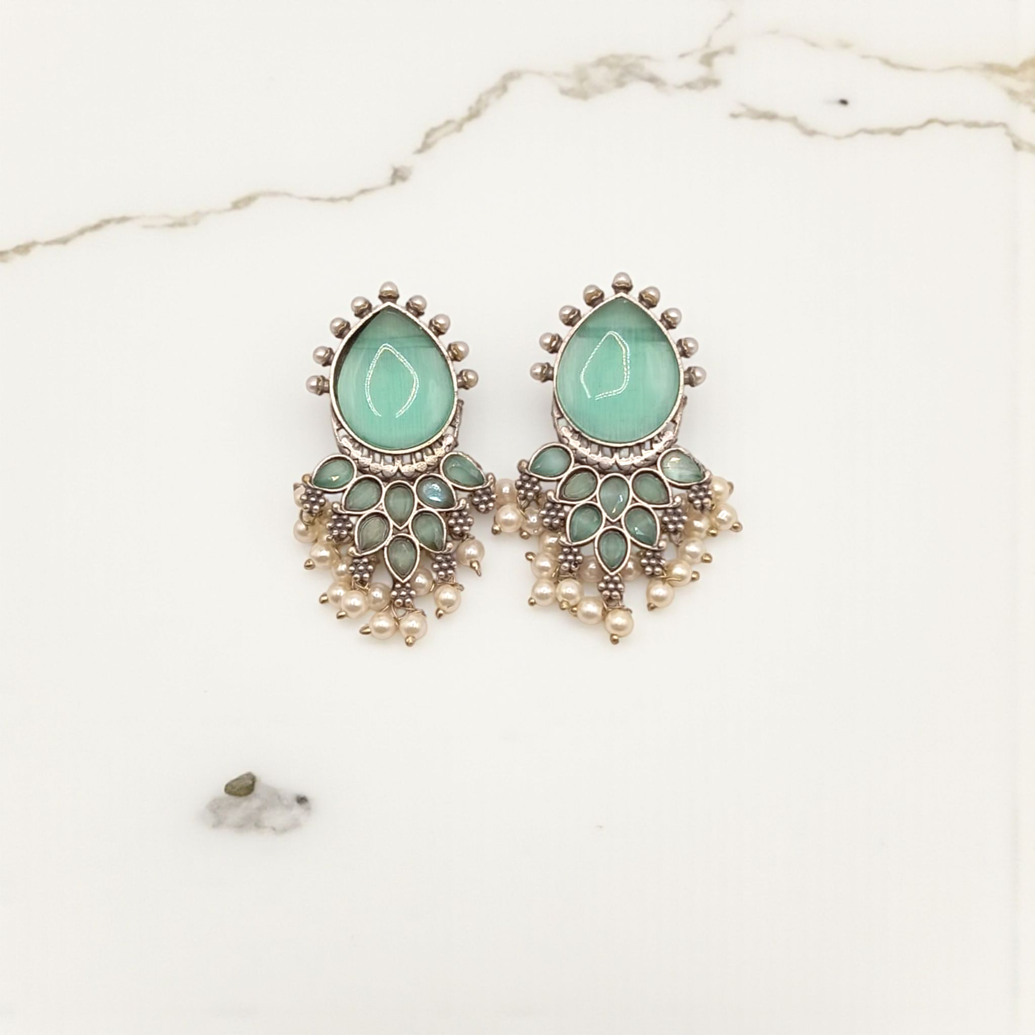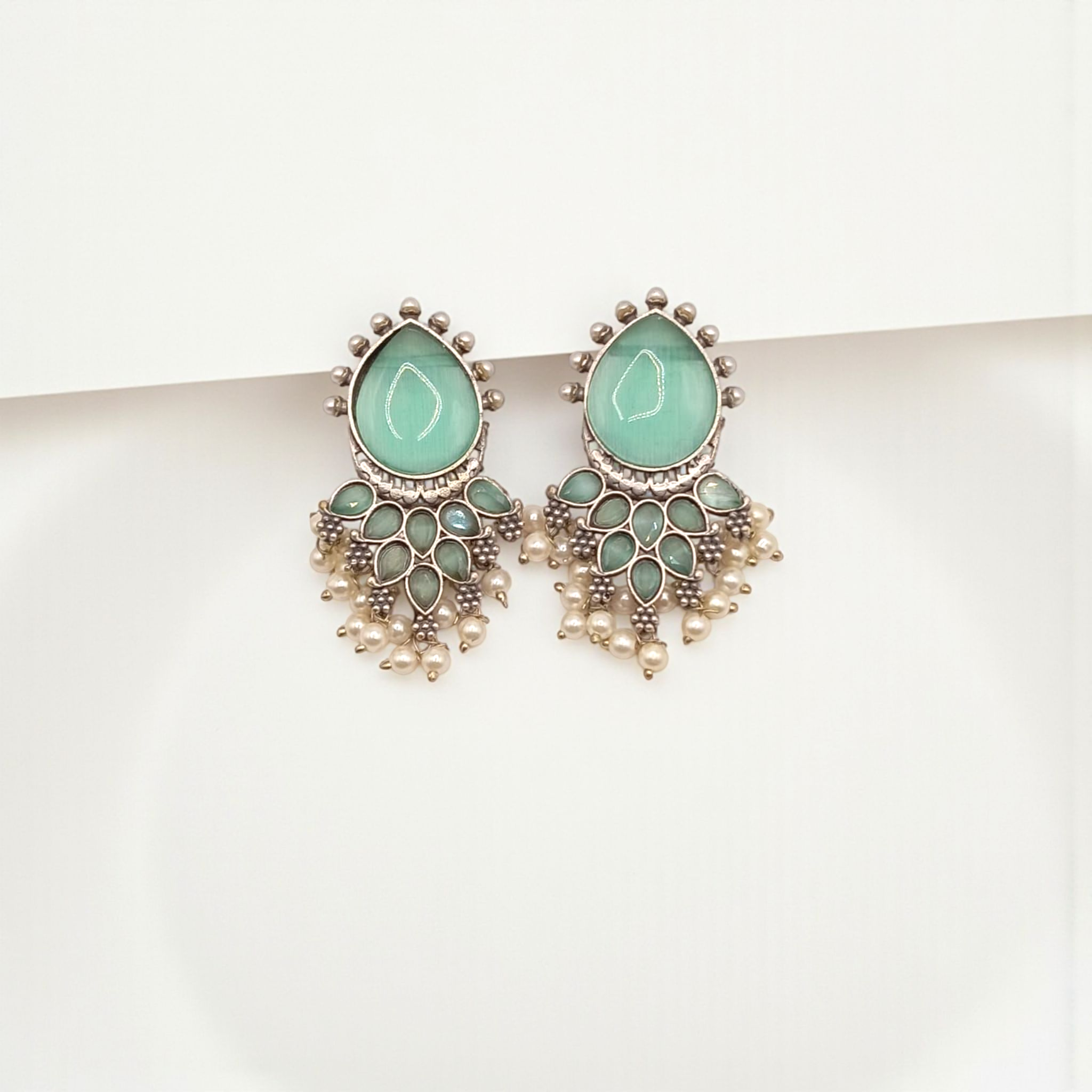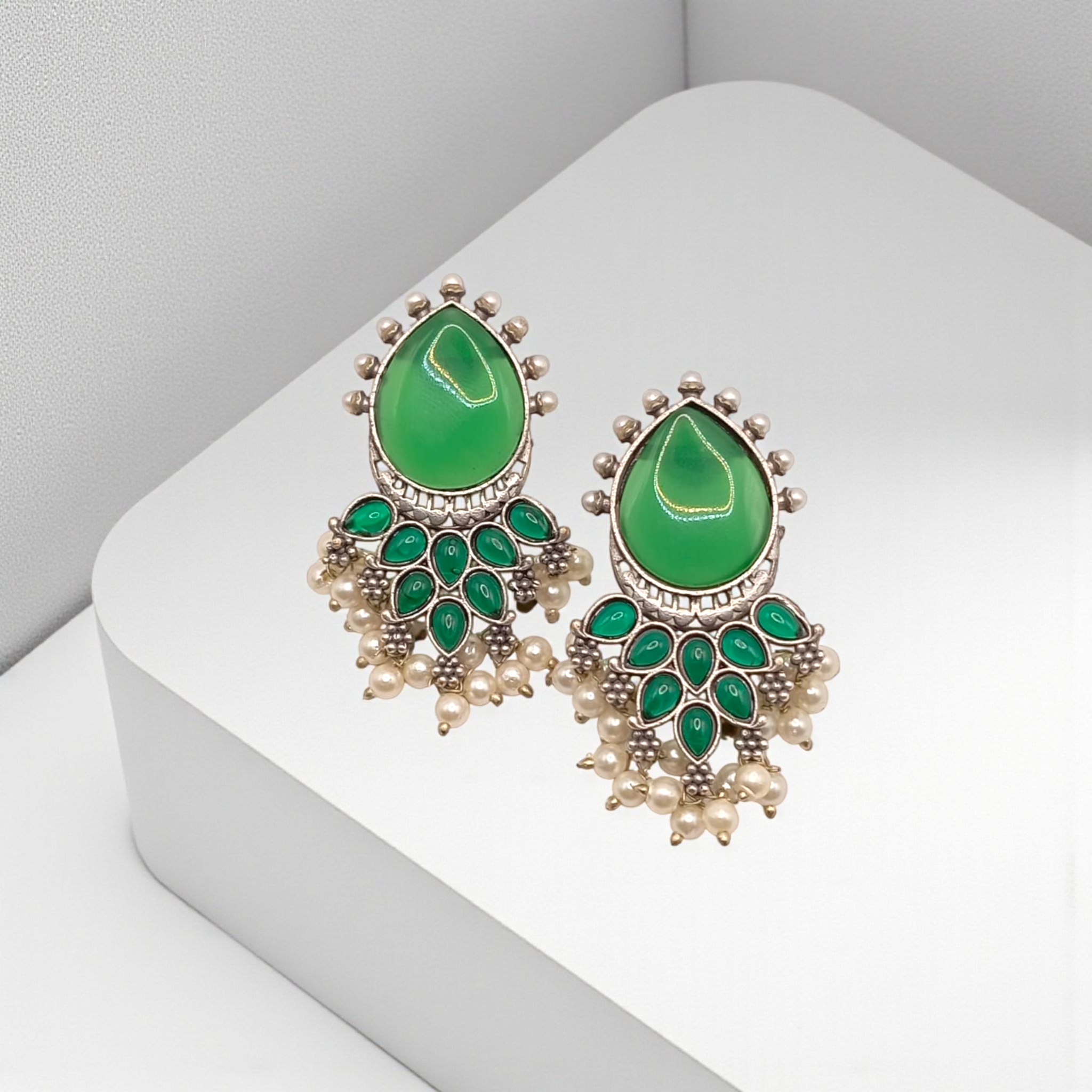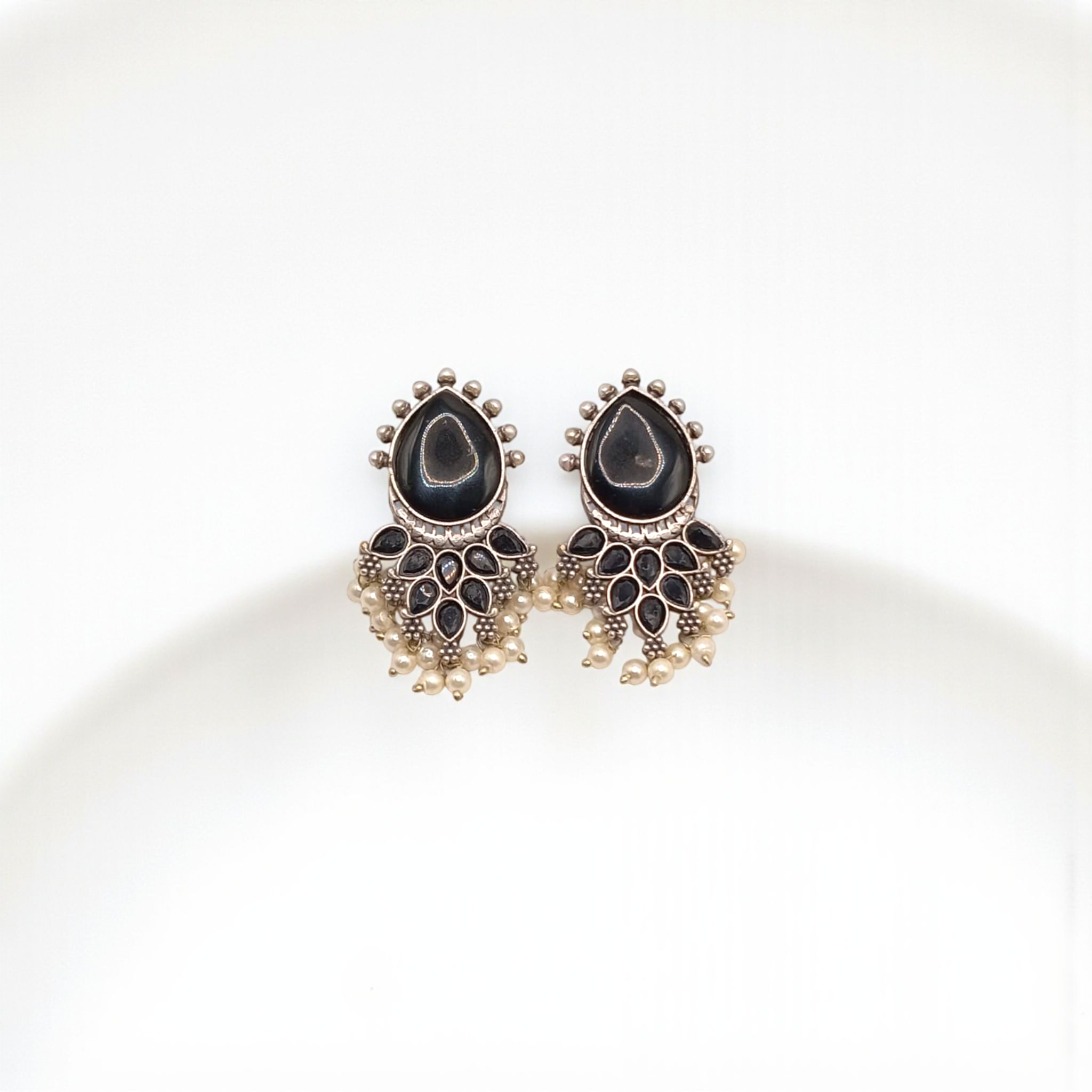 Bold and beautiful, these handcrafted earrings feature striking teardrop-shaped red stones framed in oxidized silver, detailed with petal motifs and finished with cascading pearl beads. A perfect choice for festive and ethnic looks that need a touch of vibrant elegance.