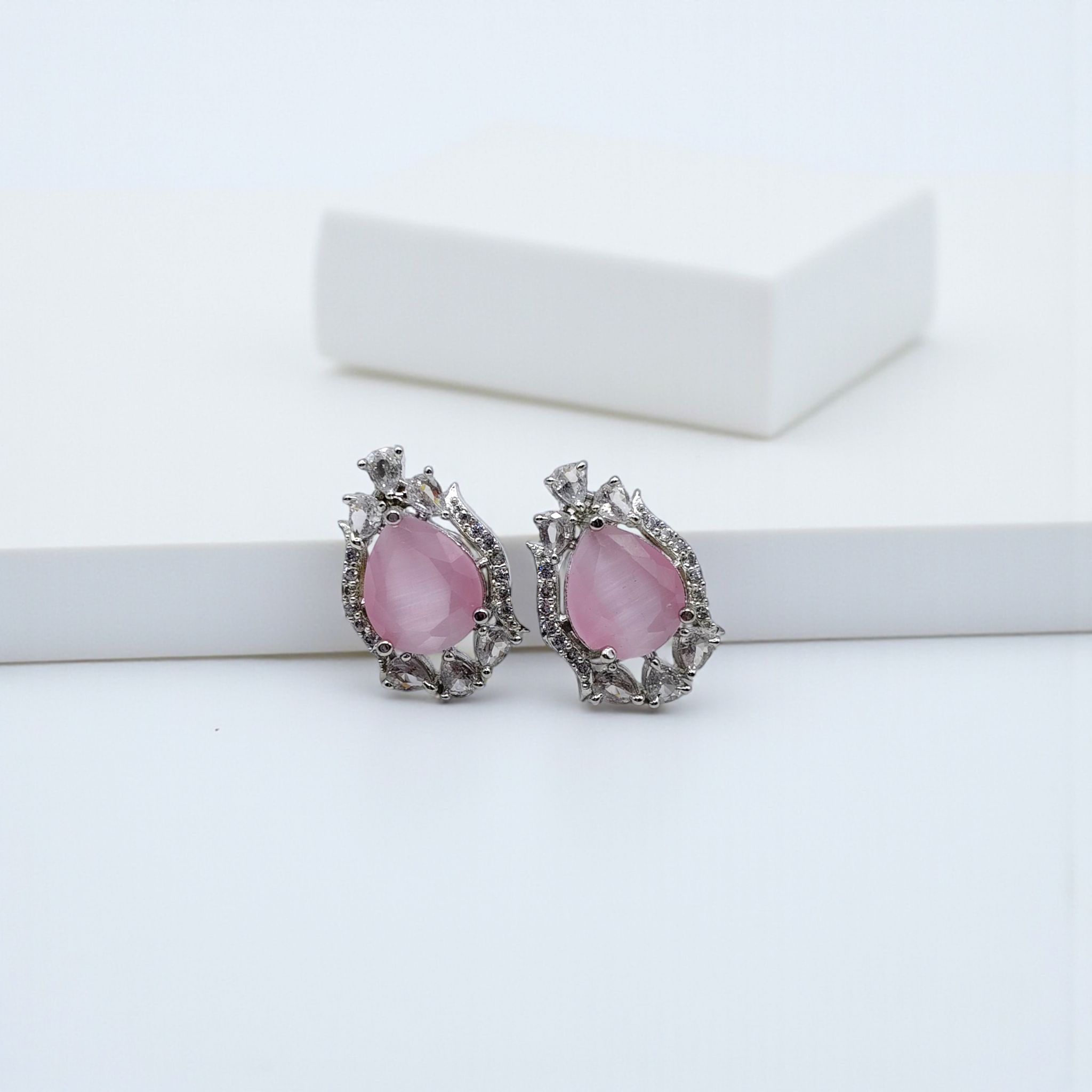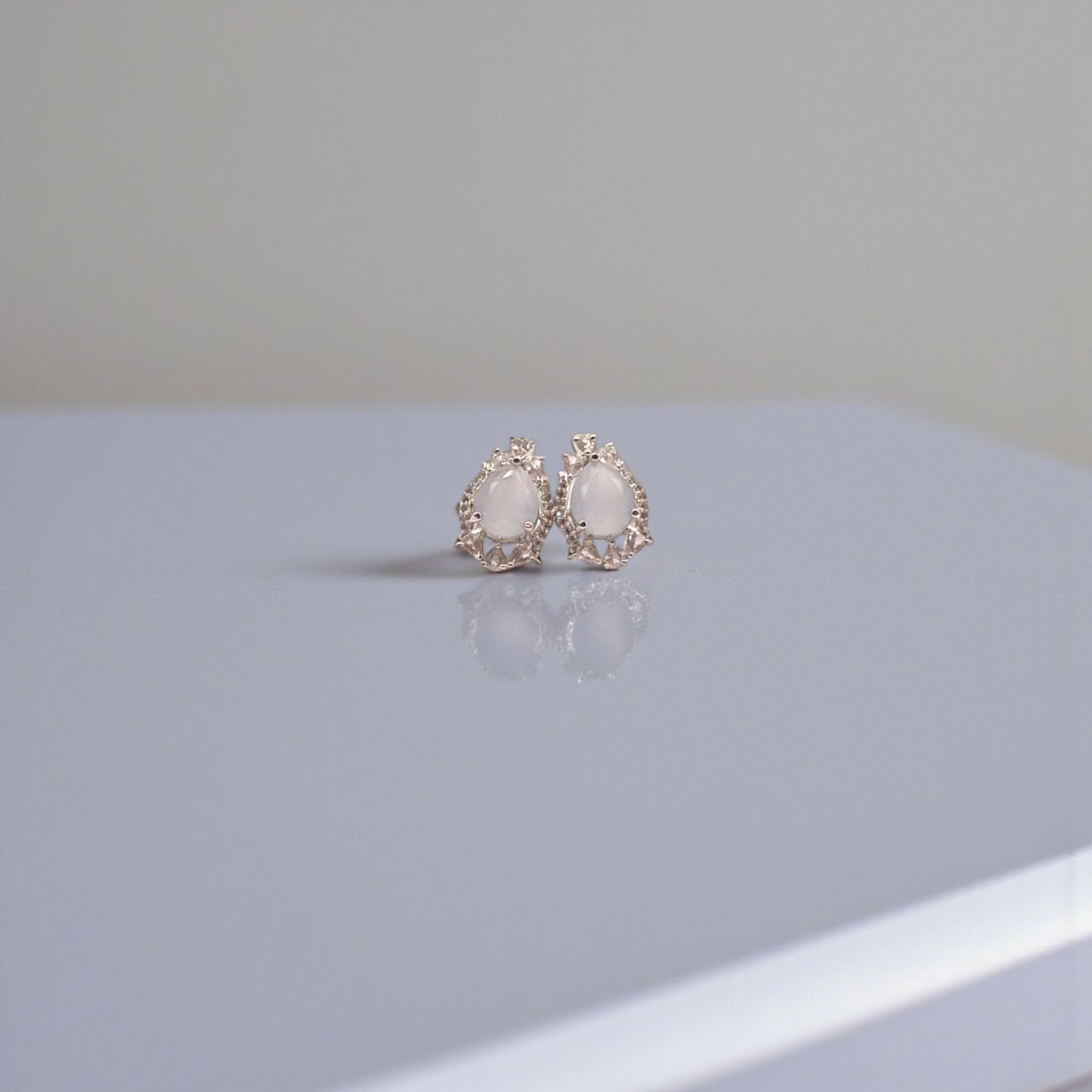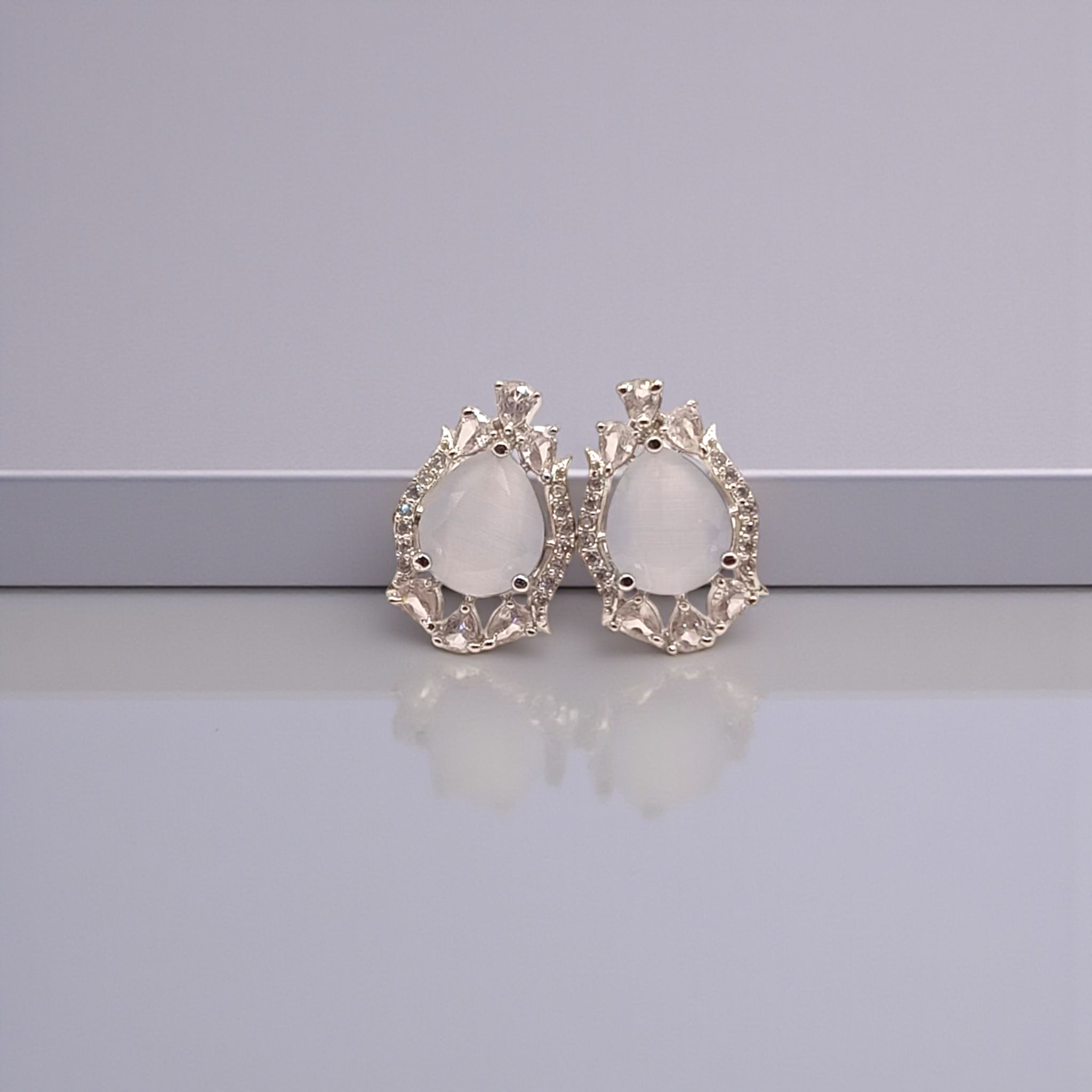 These elegant teardrop earrings showcase a soft moonstone-like centerpiece embraced by a halo of dazzling zircons. The intricate crown-like design adds a royal charm, making them perfect for formal evenings or graceful daywear.