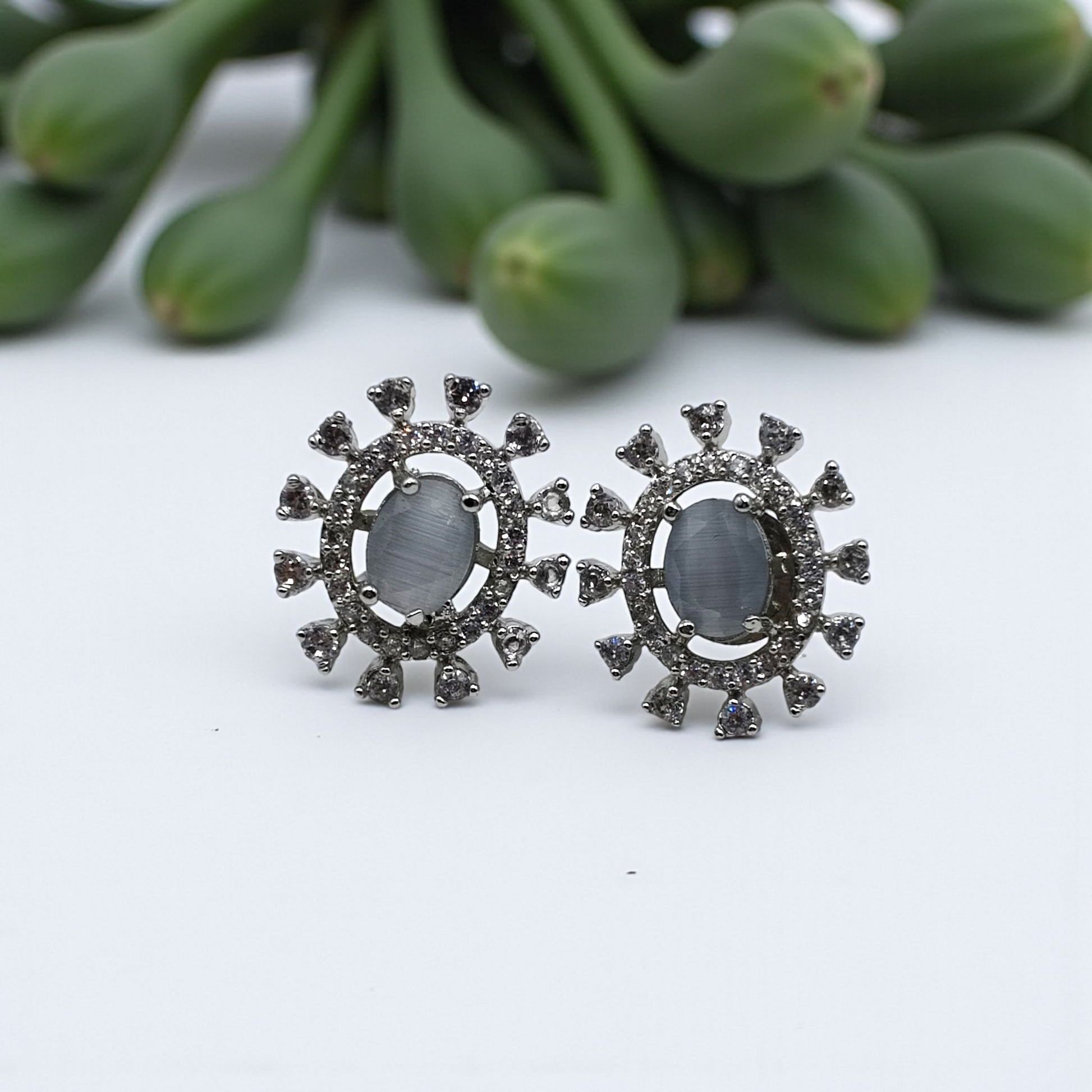 Elegant oval moonstone studs encircled by a radiant halo of sparkling zircons. These versatile earrings bring a refined glow, perfect for adding subtle charm to both daily wear and special occasions.