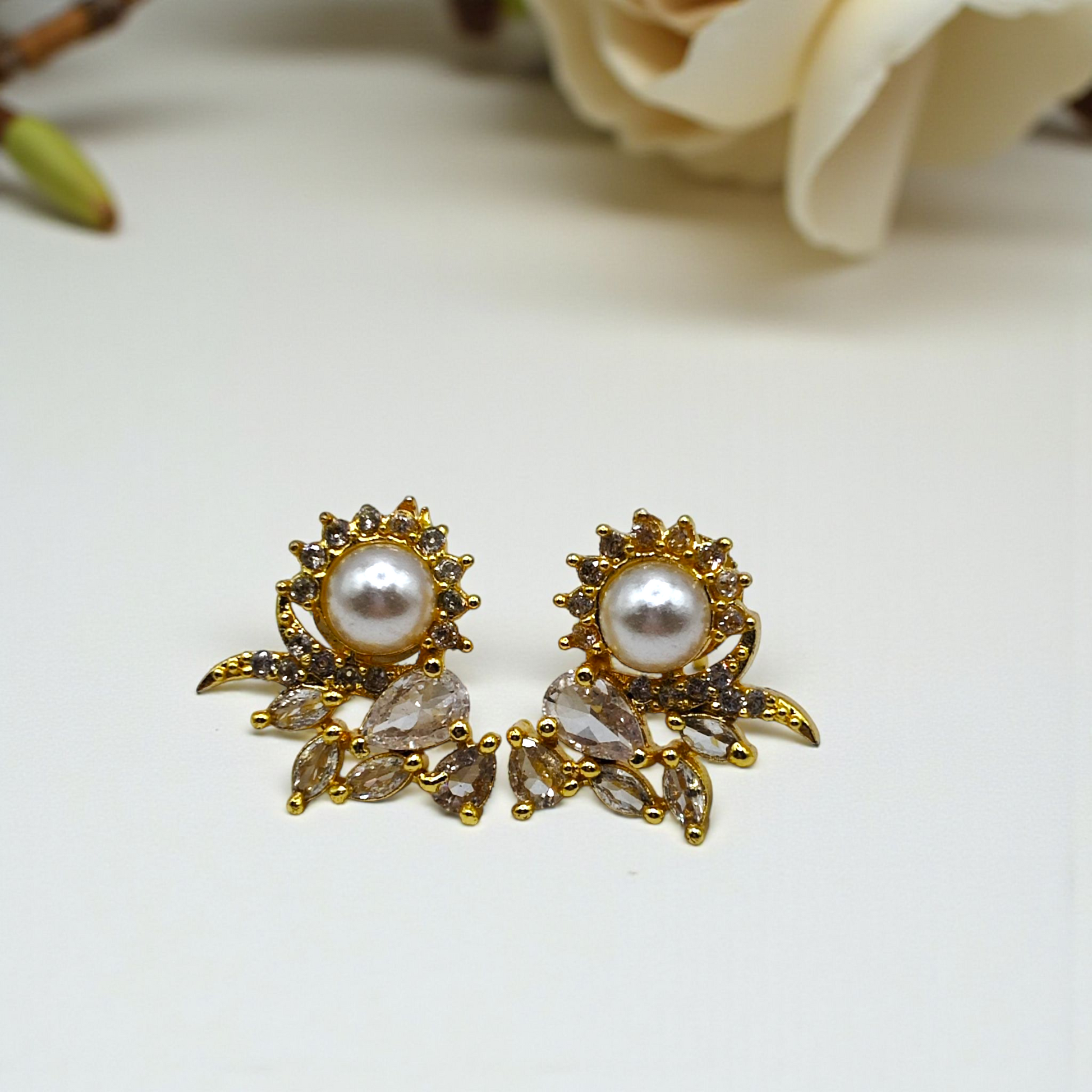 Delicate stud earrings featuring luminous pearls paired with soft green stones in a floral-inspired setting. A graceful accessory perfect for both everyday elegance and special occasions.