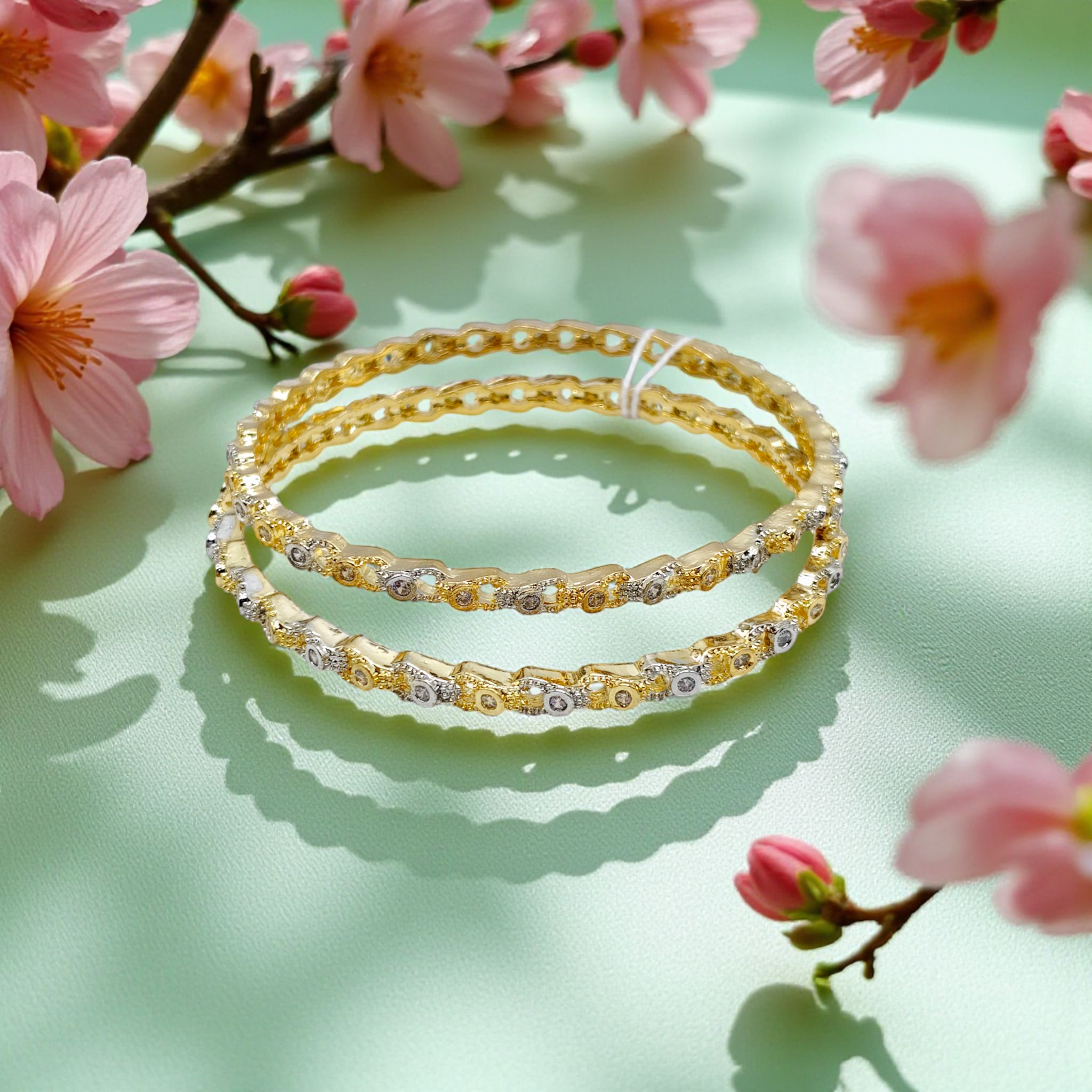 Drape your wrists in brilliance with our Radiance Bangles, featuring a seamless floral pattern encrusted with dazzling cubic zirconia. These elegant bangles are perfect for both traditional events and modern soirées.