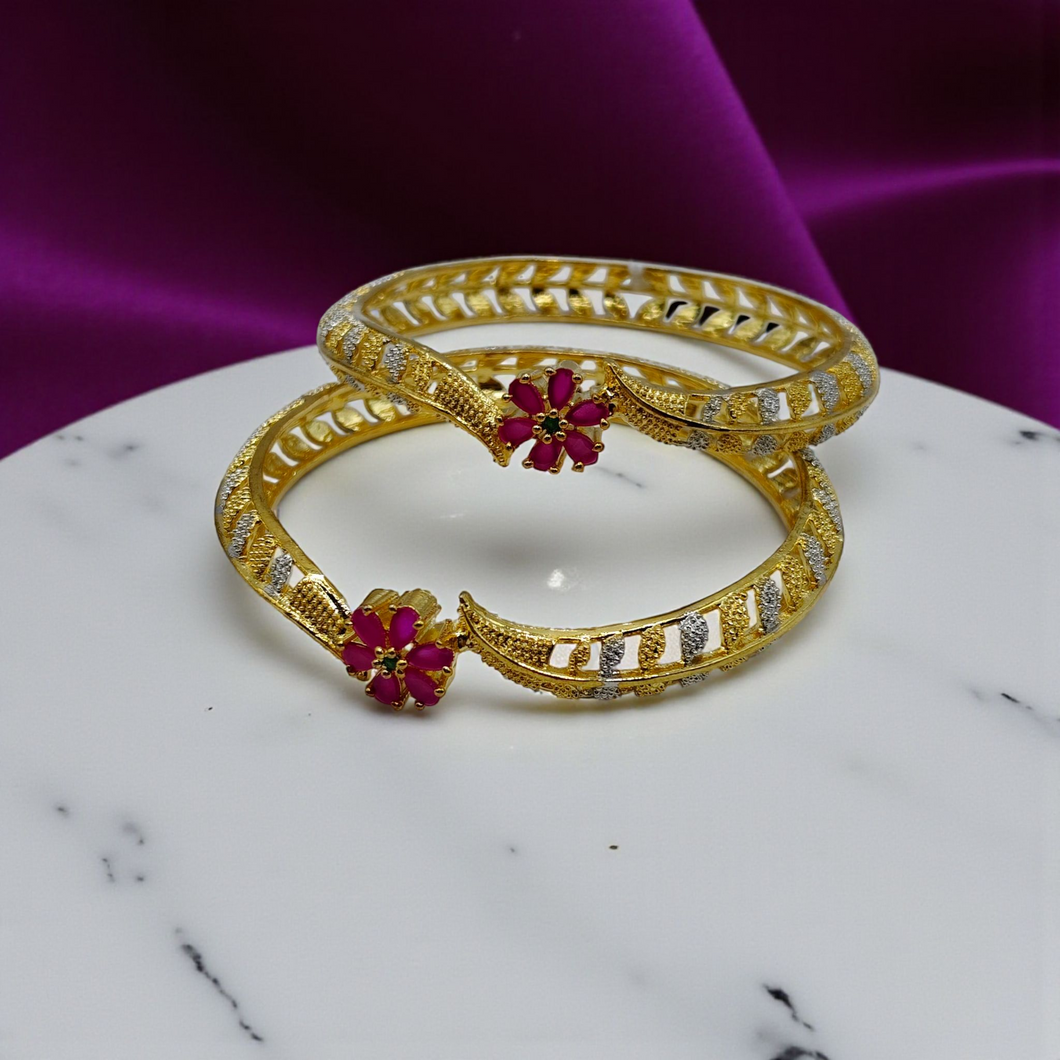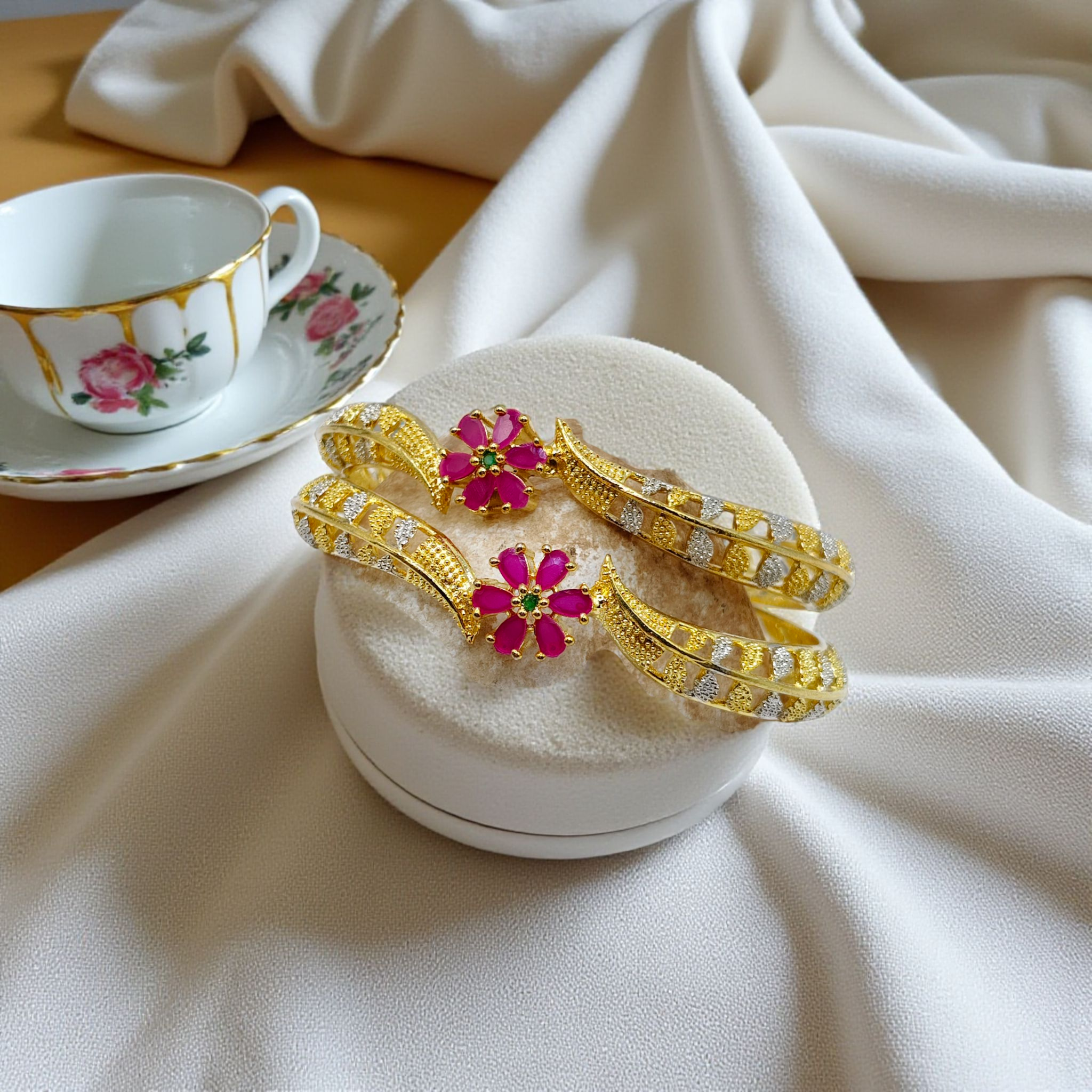 Let your style blossom with the Radiant Bloom Bangles. Designed with graceful curves and adorned with dazzling floral accents, this pair captures the essence of beauty and femininity. A harmonious mix of shimmering stones and sleek metalwork brings luxurious charm to every occasion.