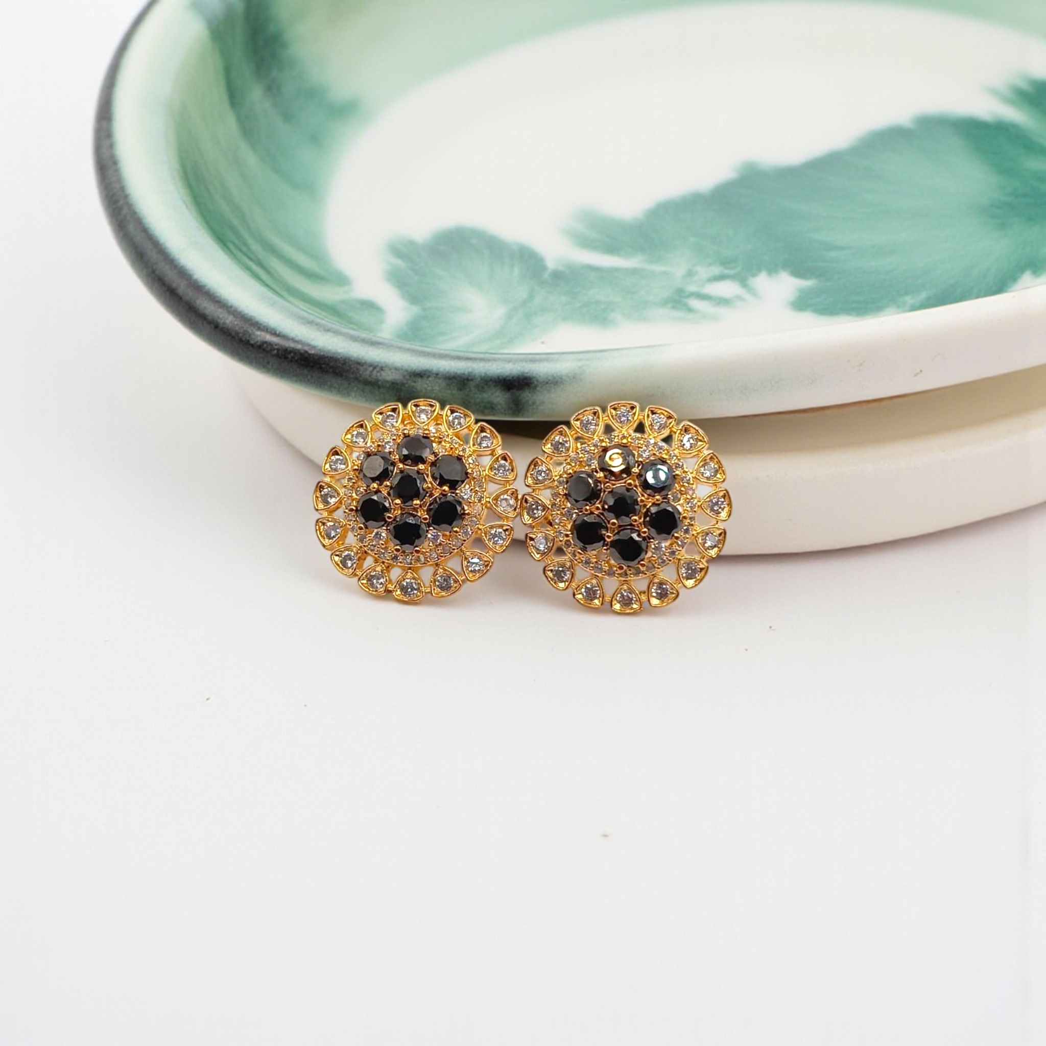 Chic gold-toned round stud earrings embellished with alternating black and clear stones, offering a perfect blend of elegance and bold style.