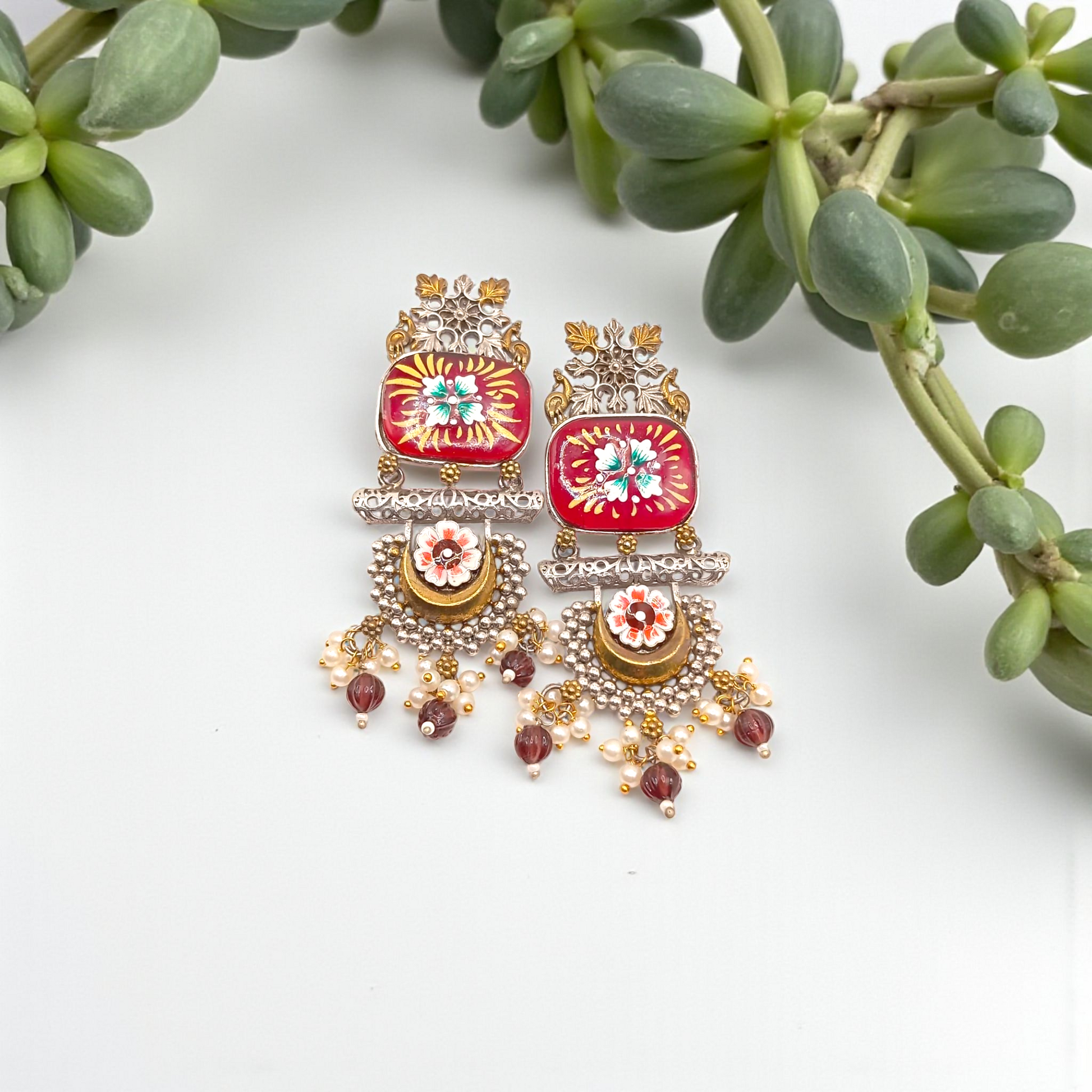 A fusion of tradition and art, these statement dangler earrings feature intricate Meenakari floral hand-painting, antique gold and silver tones, and elegant pearl and bead drops—perfect for ethnic celebrations and standout styling.